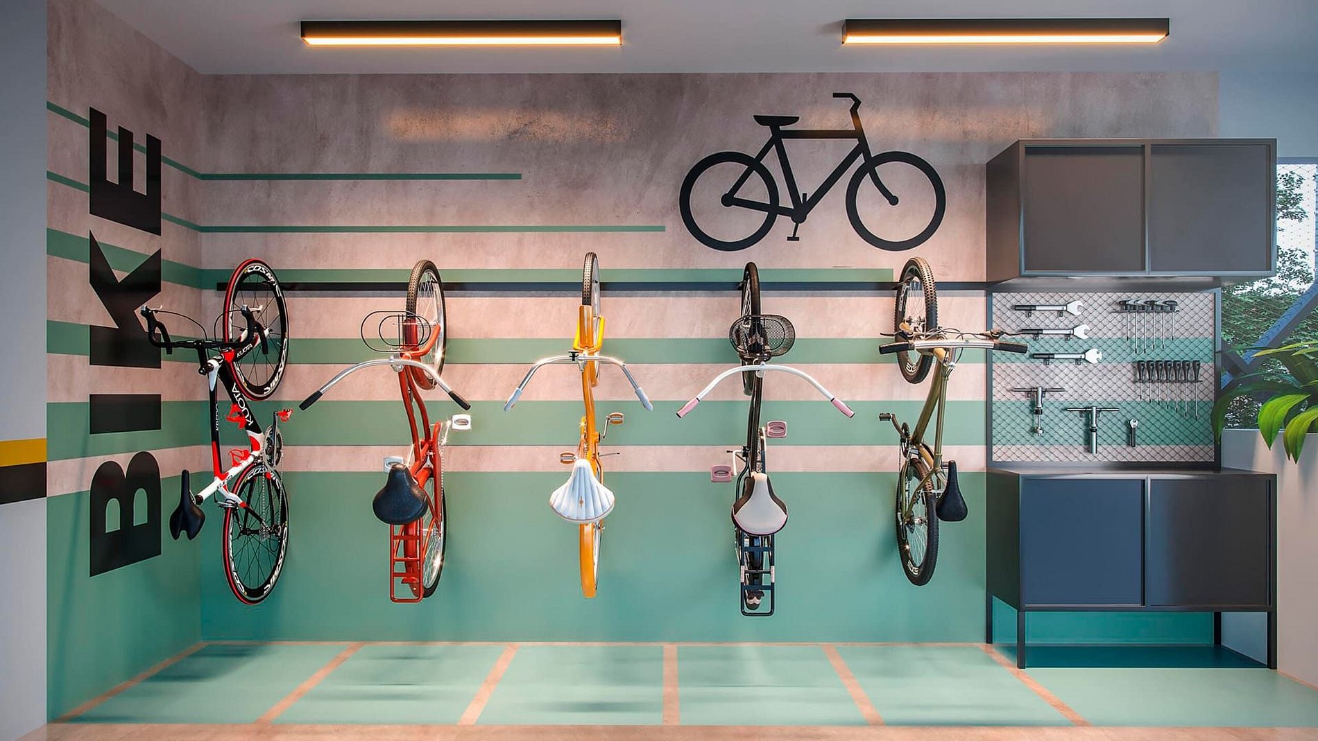 Other amenities include a bike area with a repair station, city market, delivery room, car sharing, and parking spots with electric vehicle charging. The coworking space and laundry also help create a more convenient routine without leaving home.