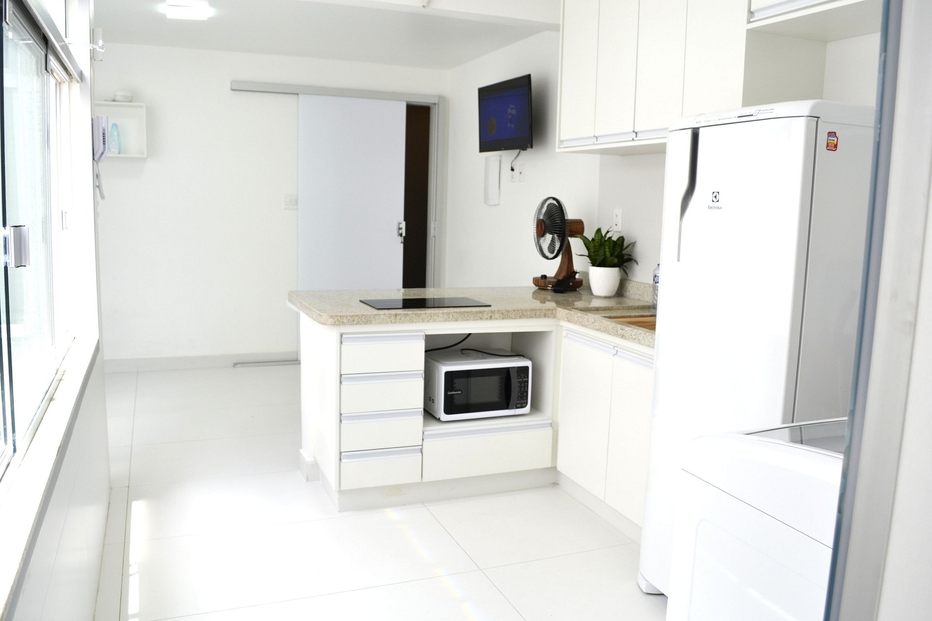 Equipped and Functional Kitchen A compact and fully equipped kitchen with a refrigerator, cooktop, microwave, and all the essential utensils for a practical cooking experience. The countertop is ideal for quick meals or working comfortably.
