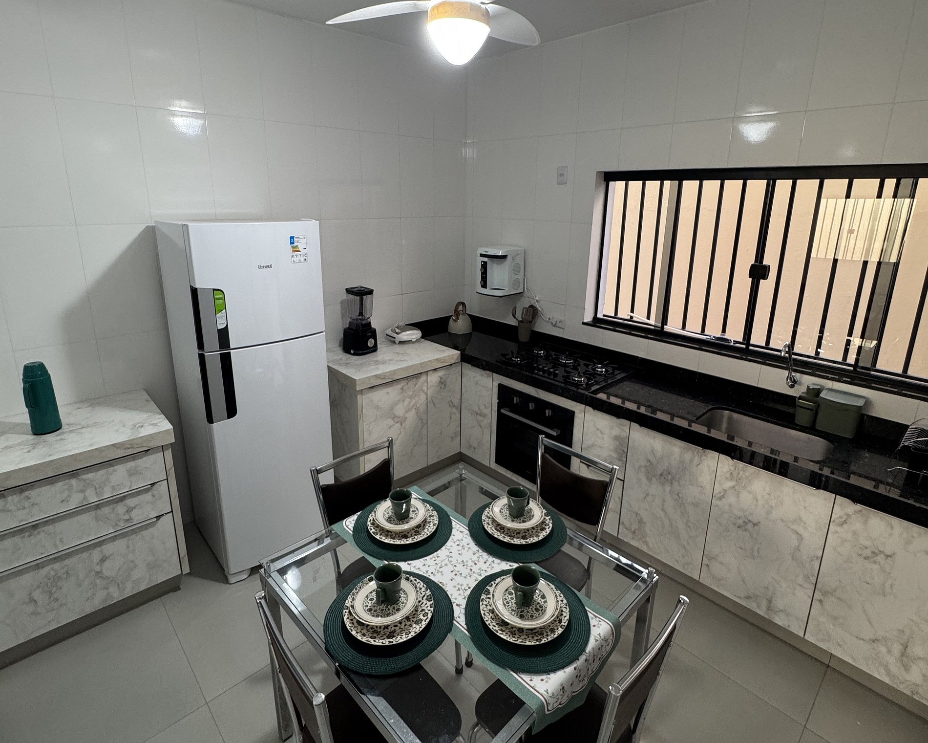 Cozinha completa equipada com geladeira, fogão, micro-ondas, utensílios e muito mais;