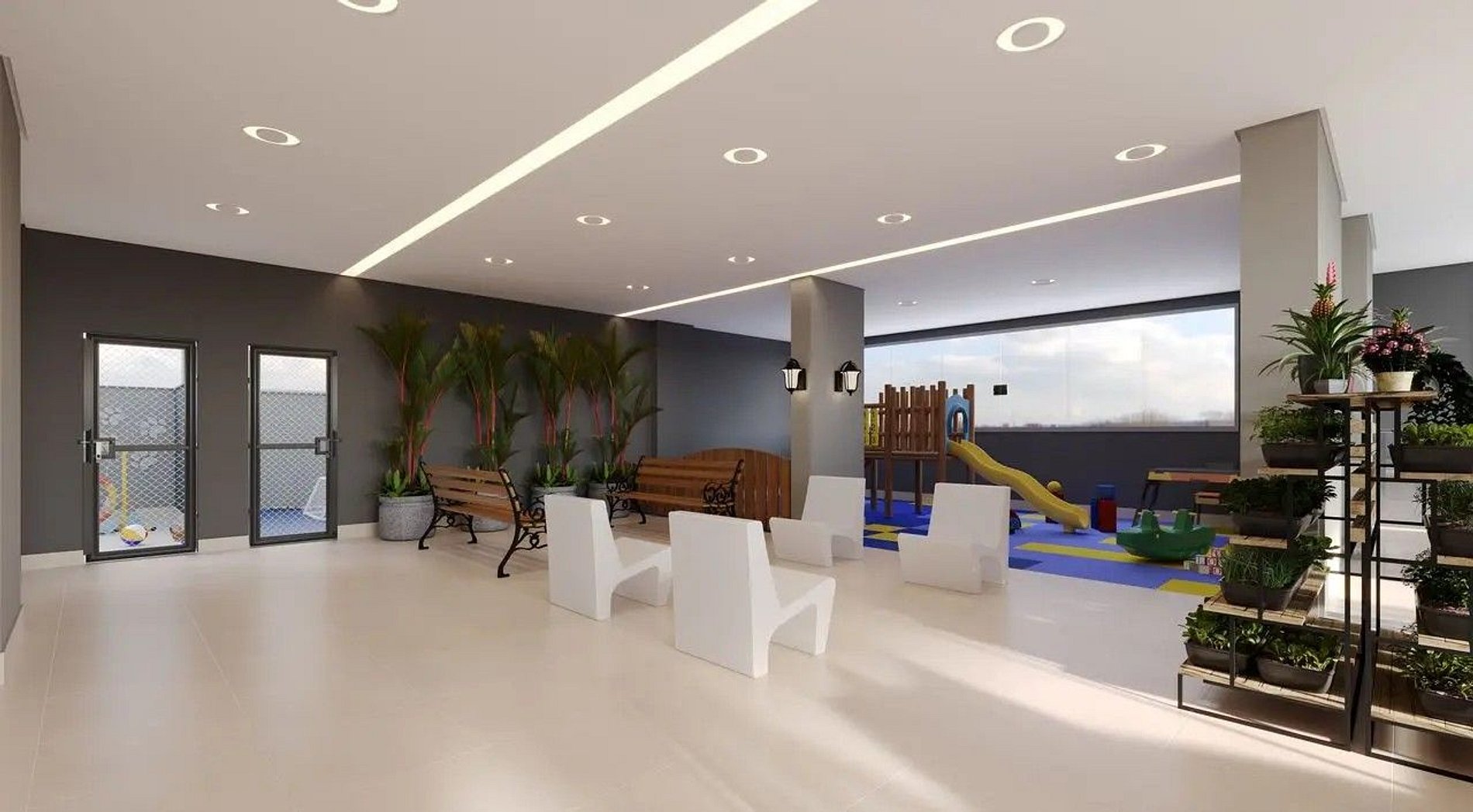 Sala de jogos, brinquedoteca e espaço office.