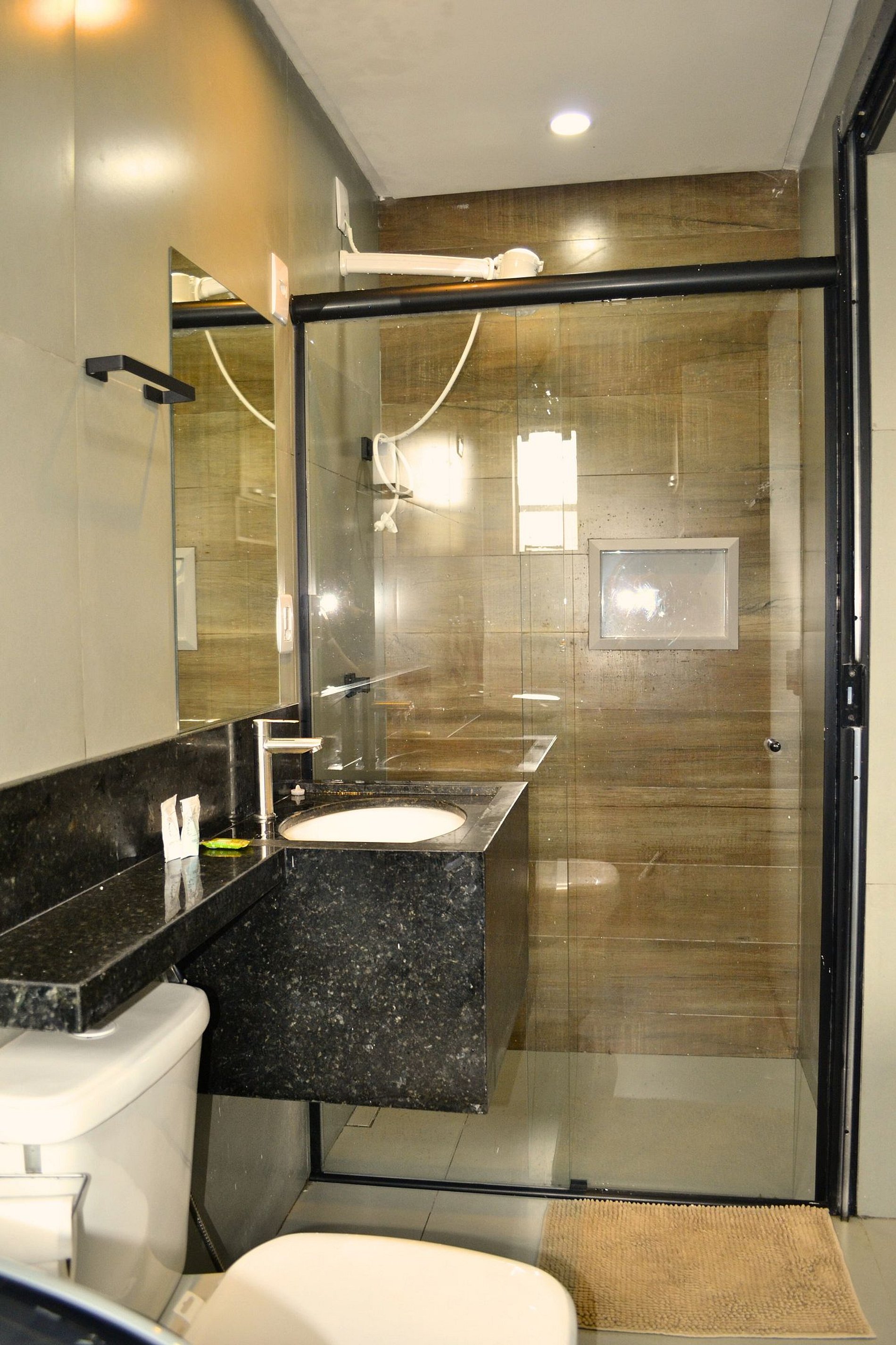 Banheiro Privativo e Lavanderia: Banheiro moderno com box de vidro e um grande diferencial: máquina de lavar roupas exclusiva dentro da unidade, ideal para quem precisa lavar suas peças sem sair de casa.