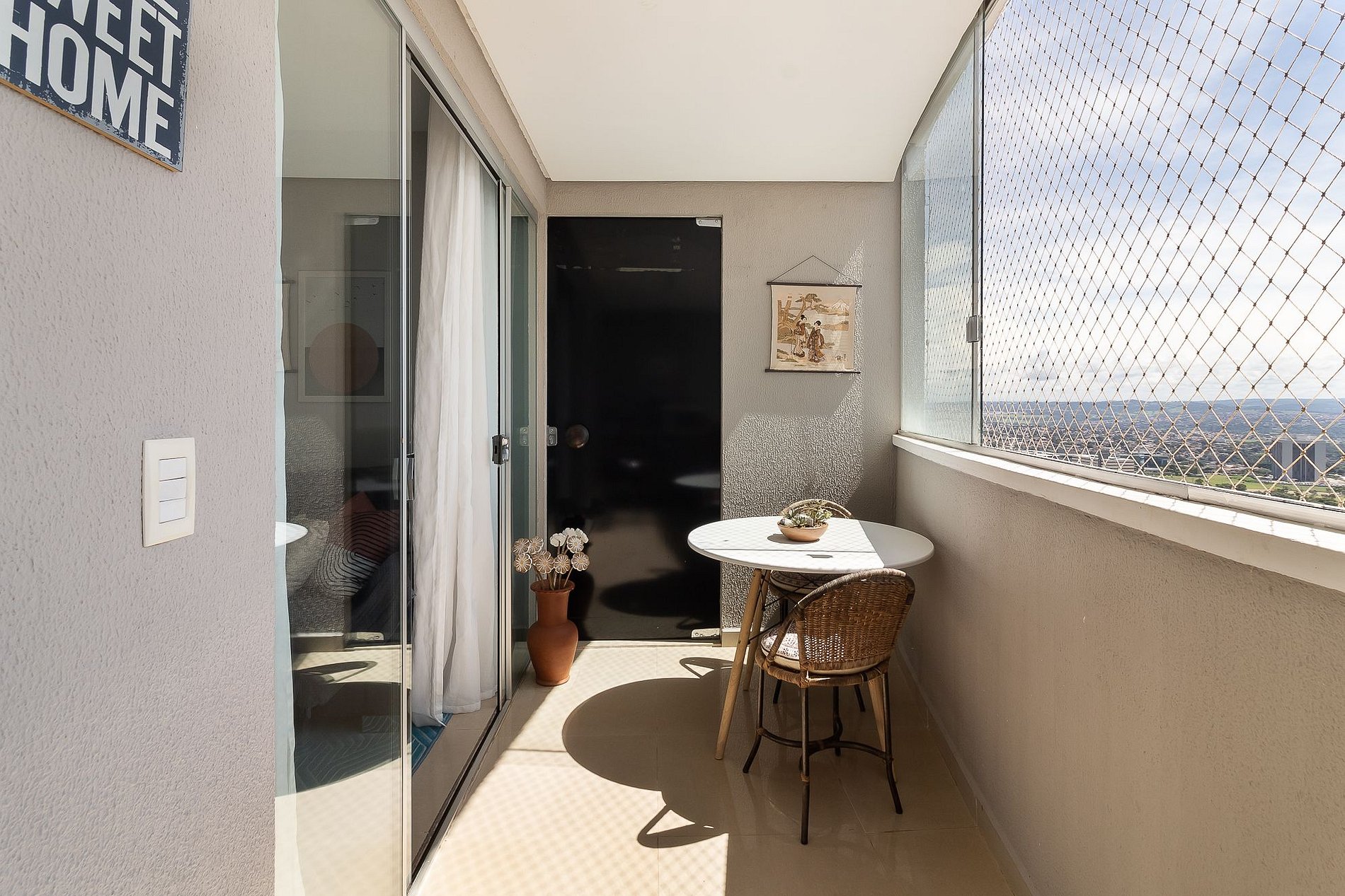 São 2 quartos com ar condicionado e uma varanda gourmet com linda vista do nascer do sol. Lava e seca na área de serviço,, forno e fogão.