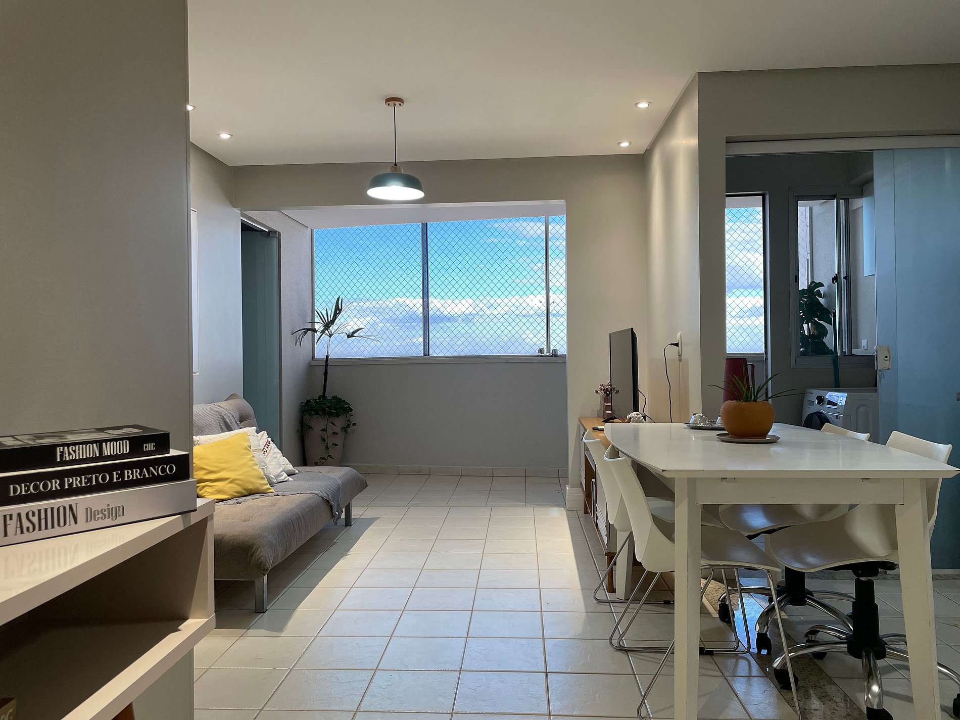 Sala de estar confortável e espaçosa com sofá cama